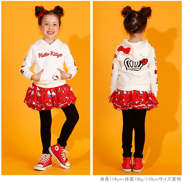 こども 子ども服 キャラクター フリルスカート 総柄 パニエ ハローキティ キティちゃん マイメロディ リボン アイコン ガールズ ガーリー かわいい 可愛い おしゃれ リンゴ ミルク 王冠ロゴ 花柄 ラブリー キュート 【別売りのトップスとセットアップ可】 ★