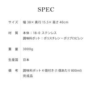 ■商品サイズ幅38×奥行15.5×高さ40cm■素材本体:18-0 ステンレス調味料ポット:ポリスチレン・ポリプロピレン■重量3000g■備考完成品【代引きについて】こちらの商品は、代引きでの出荷は受け付けておりません。