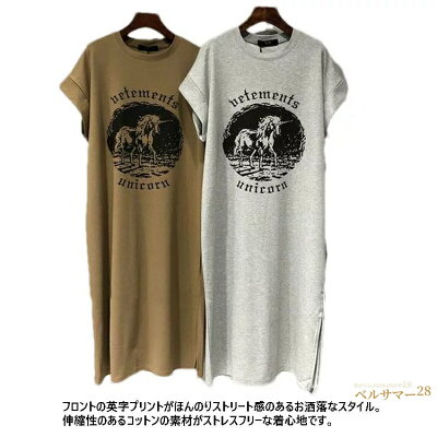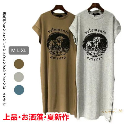送料無料 Tシャツワンピース レディース グレー ブラウン ブルー シンプル プリント ワンピース ロング丈 チュニック レイヤード サイドスリット ドロップショルダー 送料無料 春 夏 ルームウェア