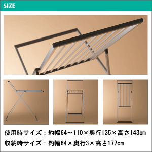 収納時は薄さ3センチと場所をとらず、軽量アルミ素材は耐久性・強度にも優れ、さらにキャスターやテンションバーなどの充実機能を満載。