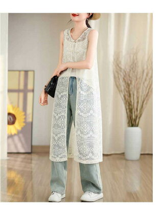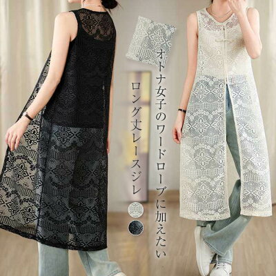 ベスト ジレ ロング丈 レディース 夏 総レース レイヤード風 羽織り 無袖 夏 透け感 お洒落 クラシカル きれいめ 着痩せ 大きいサイズ 体型カバー シンプル カジュア 薄手 旅行 海 上品