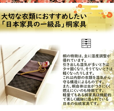 燃えにくいのも特徴で長く保つ上に安全面でも考慮した桐の和箪笥です。